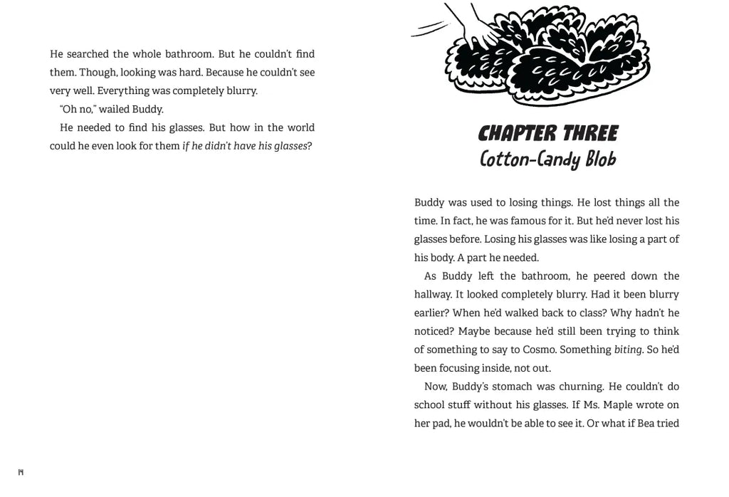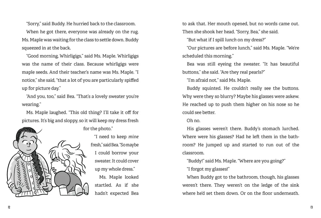 It’s picture day at school! Lots of people are dressed up, and Bea is even wearing a fluffy dress, which she’s not exactly excited about. When she tells Buddy that he should take his glasses off for the photo, he listens. But then, the glasses go missing. Are they lost? Did someone take them? Bea volunteers to find them, even though Buddy isn't sure he wants Bea to “help.”