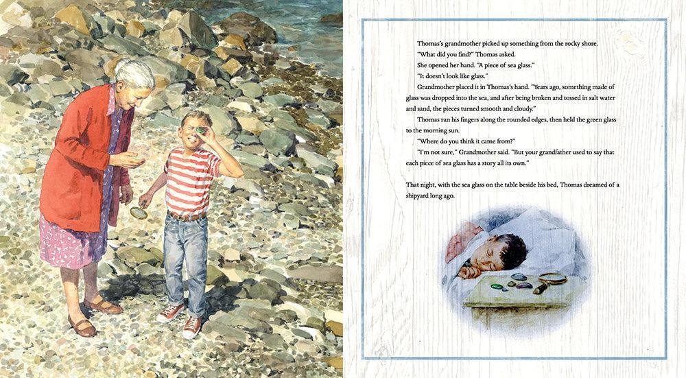 One summer, Thomas visits his grandmother at her seaside cottage. She gives him a magnifying glass that once belonged to his grandfather, and with it Thomas explores the beach. When his grandmother shows him a piece of sea glass, Thomas is transfixed. That night he dreams of an old shipyard and the breaking of a bottle. Could the very piece of sea glass on his nightstand have come from that bottle? For the rest of the summer, he searches for more sea glass and hopes to have dreams that will reveal more of the sea’s secrets...