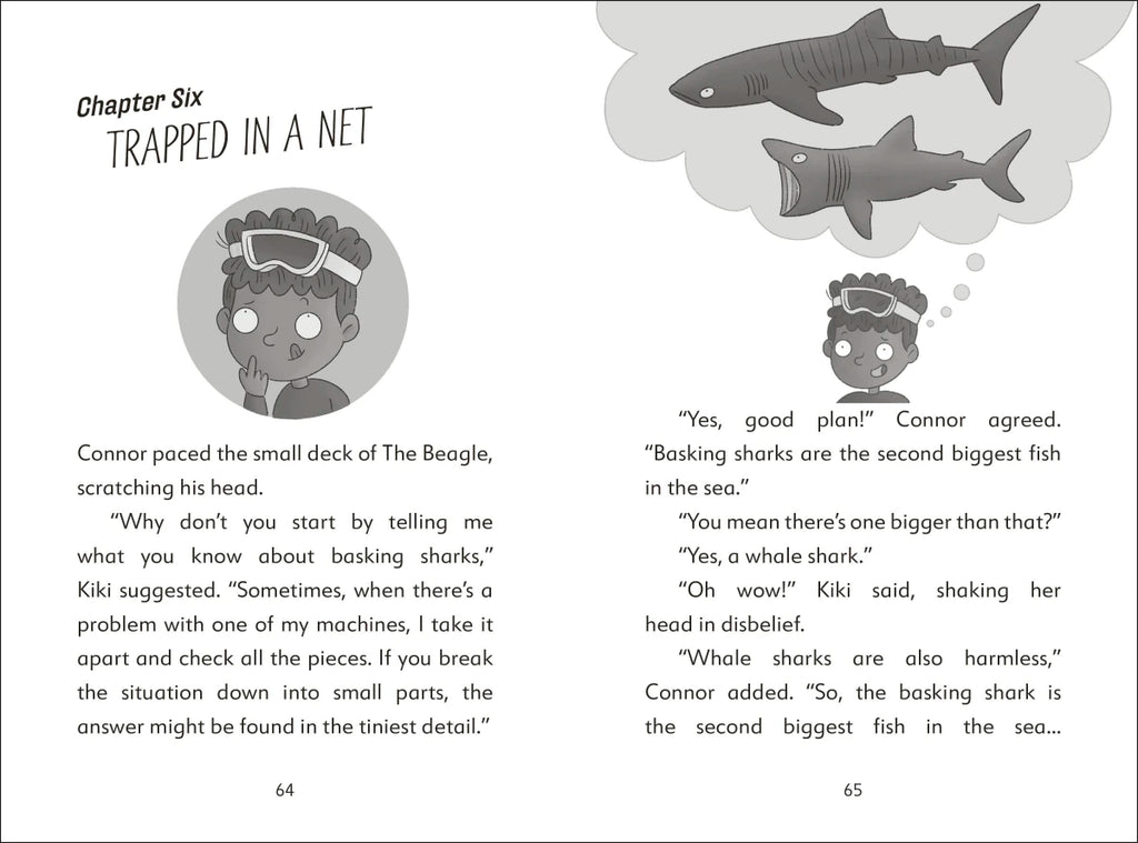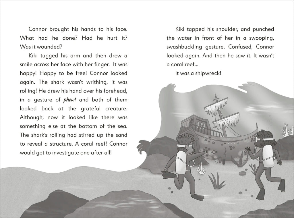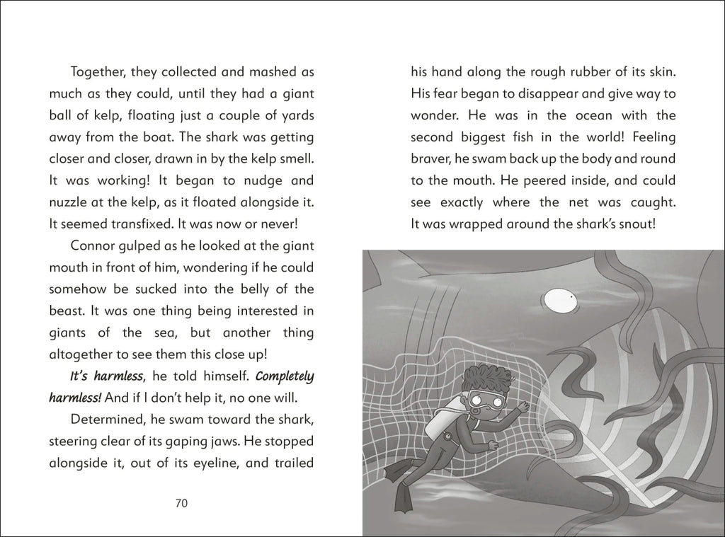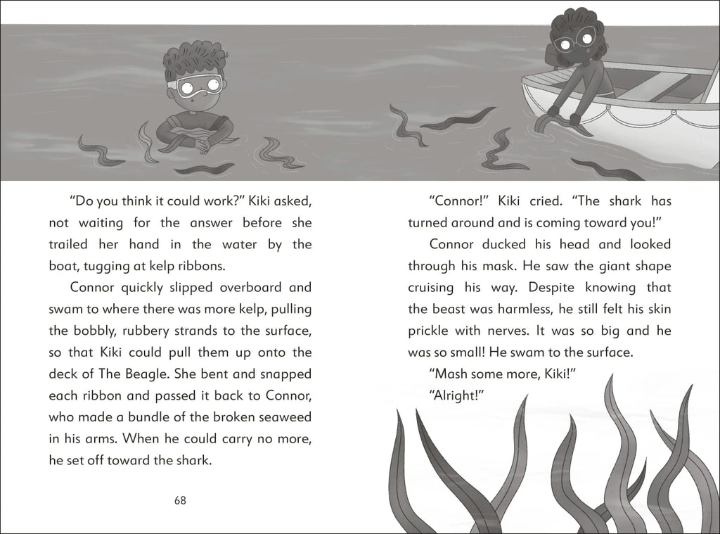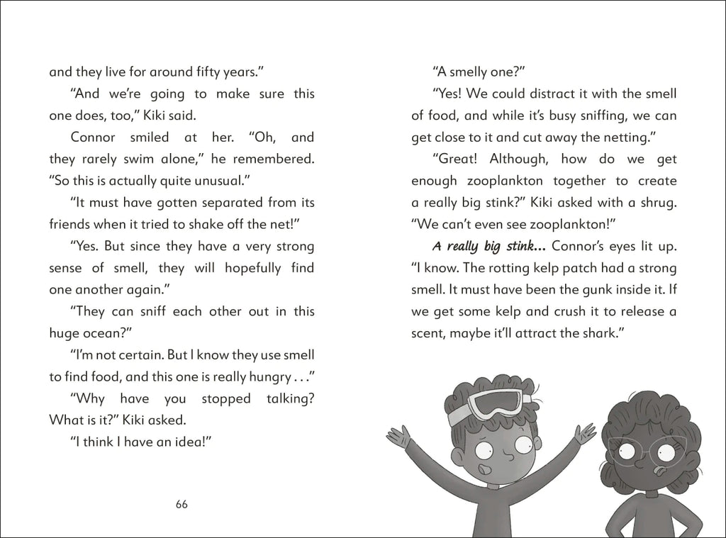 In this story, Connor and Kiki go in search of pirate treasure, but their plans change when they encounter a basking shark in need of help. Can they find the treasure as well as rescue the shark? Only time will tell!! The gripping narrative is filled with scientific facts as the explorers navigate the ocean and come across different ocean life and species.