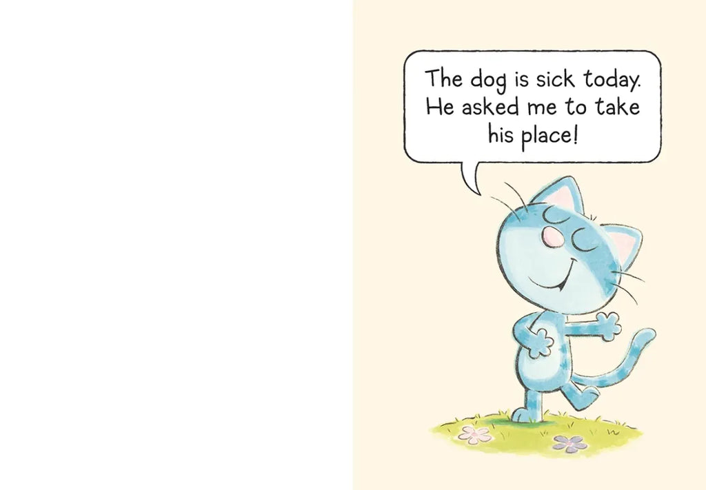 The dog is sick today, but have no fear—the cat is happy to take his place! But when the book (who is very bossy) tells her to dig a hole, the dirt-averse cat finds a way to accomplish the task while keeping her fur pristine. And when the book demands that she fetch a stick (in the water!) or guard a sheep (from a wolf!), the cat responds in very un-doglike ways. Can the book and the cat reach a happy ending? With simple, repetitive phrases and tongue-in-cheek humor, this spoof on a classic early reader pits a well-meaning but slightly dramatic cat against a highly persistent book in a comical battle of wits that will have kids yowling.