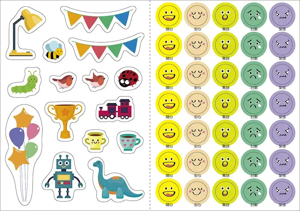 每冊均附100張貼紙,可重覆黏貼於本書內頁,讓孩子依據各單元情境,貼上相應的表情,練習辨識與表達自我情緒,貼紙遊戲讓學習更有趣、表達更活潑!