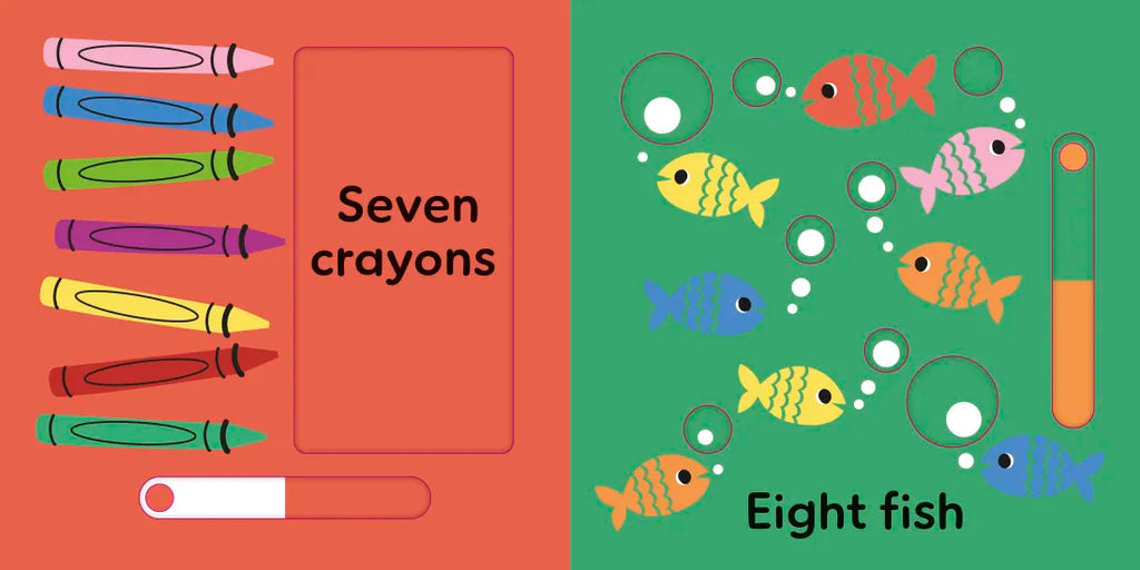 A fun and colorful board book with sliders to help young children learn their first numbers.