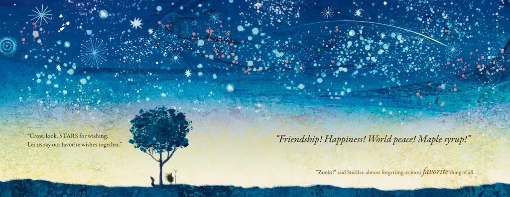 Stickler, an original character covered in sticks and with multiple ever-changing eyes, loves its little world. With best friend Crow, it shares the wonders of all the amazing things the world has to offer. Stickler is astonished by the ordinary, such as the sun and the stars, as well as fascinated by those things in nature that are often overlooked, such as swirling seed pods falling from the sky. The two pals wander about the world, stopping to appreciate the many marvels along the way, especially its beloved sticks, each one unique.