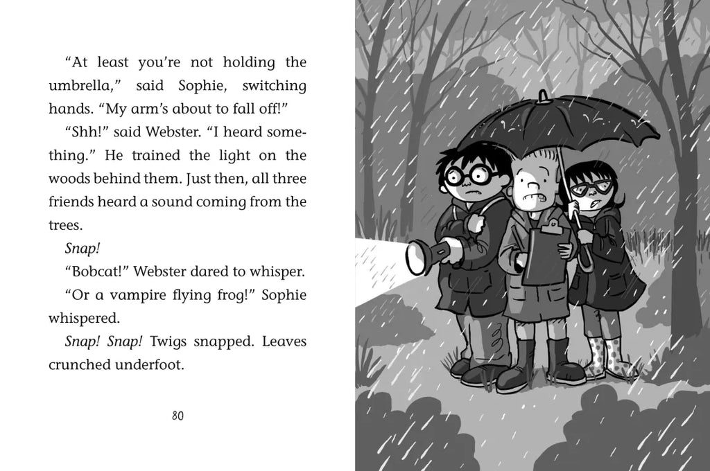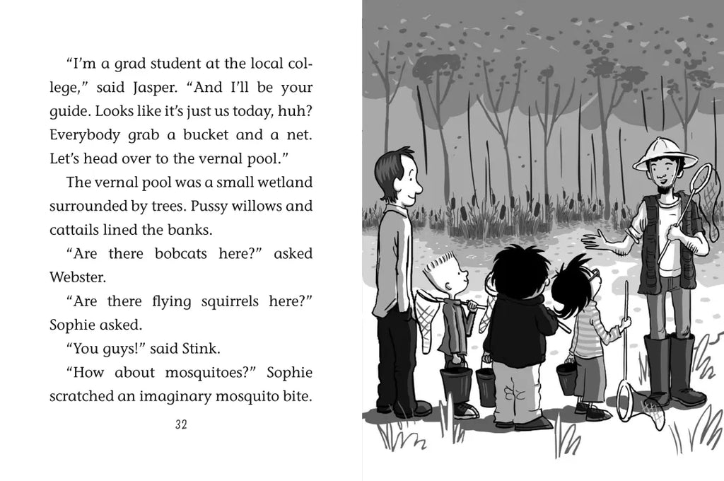 Stink may be super smart, and Stink may be uber clever, but he’s been in the Polliwog swim class frog-ever and he still can’t bear to put his face in the water. Why would he want a geyser up his nose, on purpose? But then something weird happens: Stink starts to see frogs everywhere — in the locker room, in his boot, in the bathtub. And when a freaky blue frog licks his arm, his froggy senses start tingling! He has an urge to slurp up raisins (that look like flies). He can’t wait to play in the rain and mud. He’s a wiz at identifying frog calls. And he has become very interested in the local frog population. Could it be that Stink is turning into . . . the amazing Stink-Frog, fighter of slime? Pree-eep! Craw-awk!
