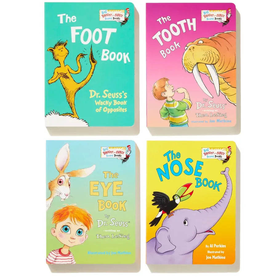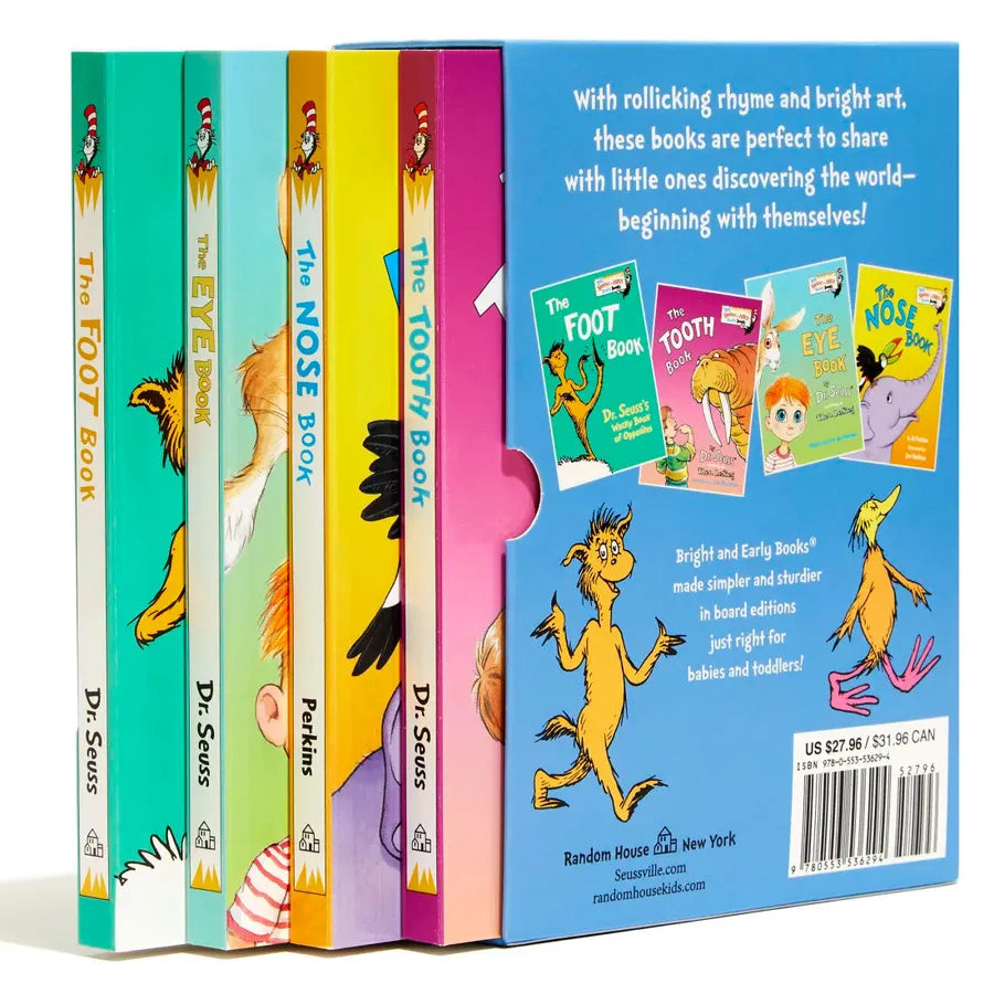 The four larger board books in this sturdy slip-case are The Foot Book by Dr. Seuss, The Eye Book by Dr. Seuss, The Tooth Book by Dr. Seuss, and The Nose Book by Al Perkins. Adapted for babies and toddlers from Dr. Seuss's Bright and Early book line, each of these books is filled with rollicking rhymes and clear, colorful illustrations by Dr. Seuss and Joe Mathieu. Perfect gifts for little ones as they explore the world—starting with themselves!