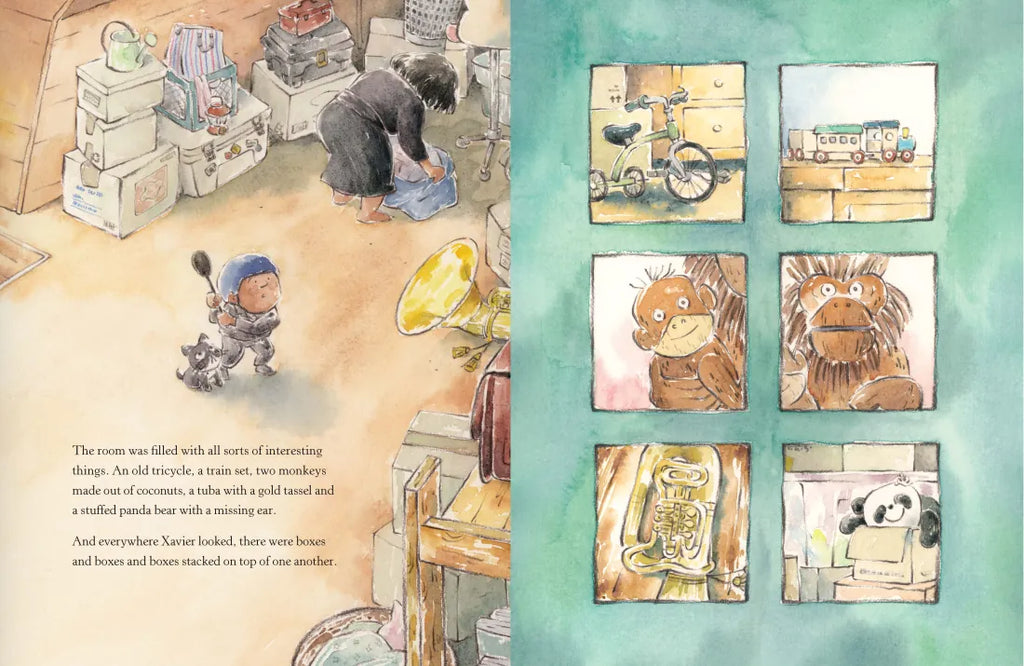 At first, Xavier is a little nervous. Though there are no dragons up there, it looks like a dragon's cave — it's gloomy, dusty and full of cobwebs. But as Xavier explores the attic, he discovers all kinds of interesting things: