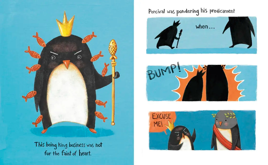 Percival the King Penguin doesn’t think he’s asking for too much when he makes all the rules—he is a king after all. But he’s tired of the other penguins protesting, so he’s off to find subjects who are more obedient and supportive.