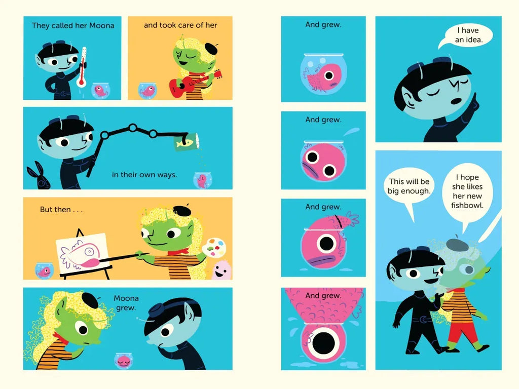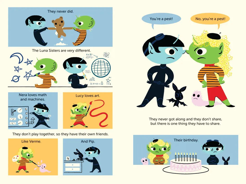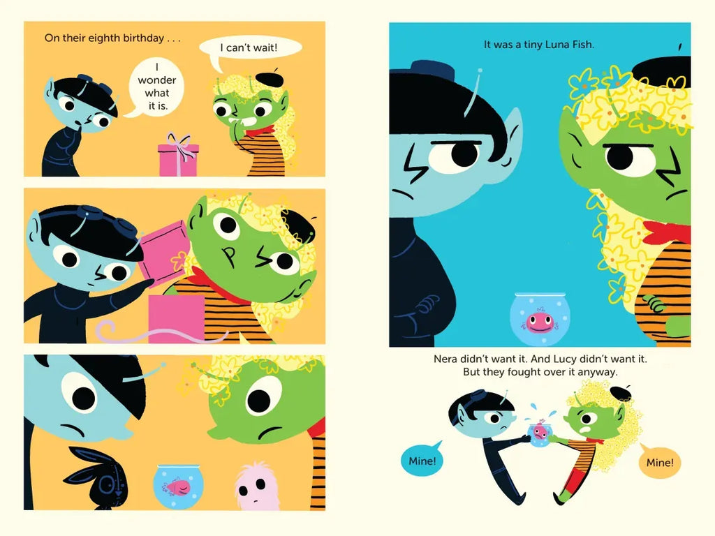 The Luna Sisters live on the moon. Lucy lives on the bright side. She loves being creative. Nera lives on the dark side. She is always building new machines. The sisters never share anything, until they get a new pet for their birthday–Moona the fish. The girls set aside their differences to take care of their fish.