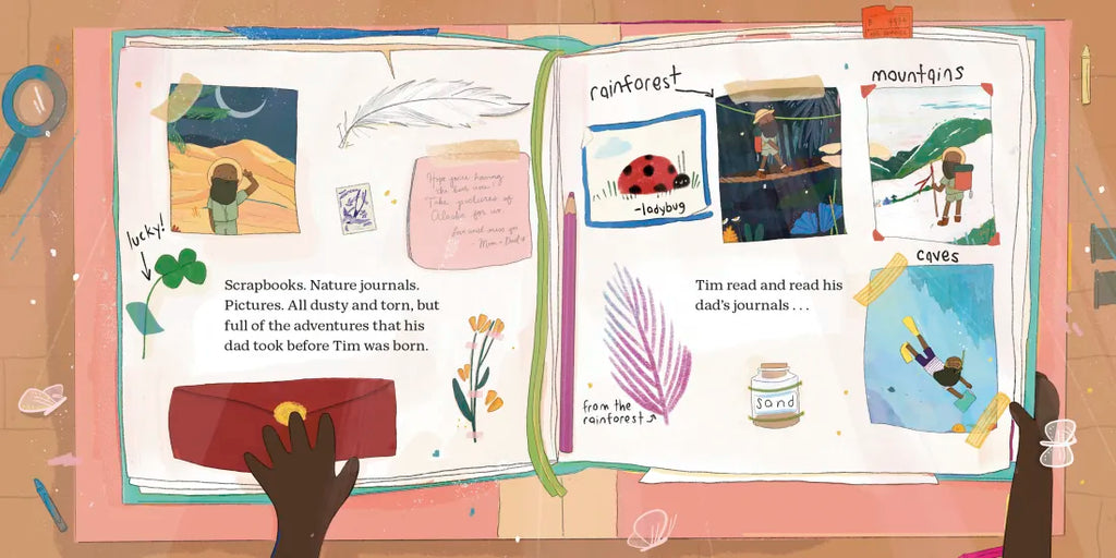 Tim has always loved nature. His dad always taught him to explore and adventure through their own backyard. So Tim observed, he collected, and he recorded it all in his nature journal, just like Dad!