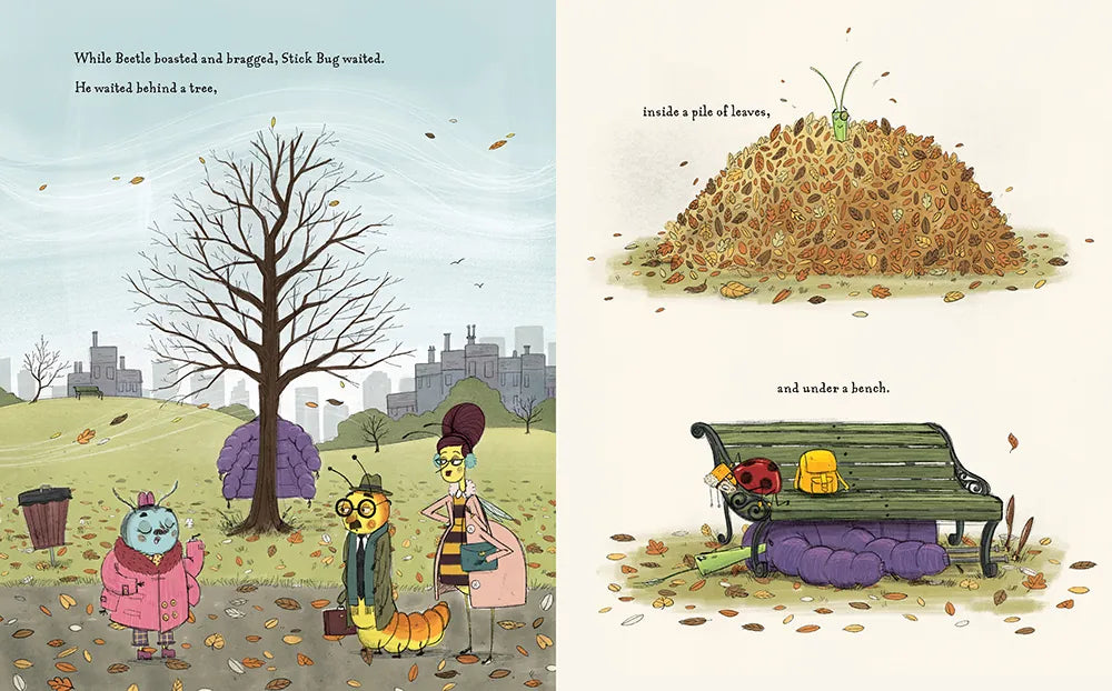 It’s almost Stick Insect’s birthday, and his fashionable friend Beetle can’t wait to give him his present – a purple puffy coat! The coat draws a lot of attention and makes Stick Insect really stick out in the crowd. Beetle thinks that’s terrific! He takes Stick Insect all over town, happily boasting and bragging (while Stick Insect waits behind a tree, in a pile of leaves, or under a bench). Oh, dear – maybe Stick Insect isn’t as happy about the purple puffy coat as Beetle is! What can Beetle do to make Stick Insect feel more comfortable? Charming illustrations bring to life both characters’ endearing struggles in this warm and humorous story about friendship and understanding each other.