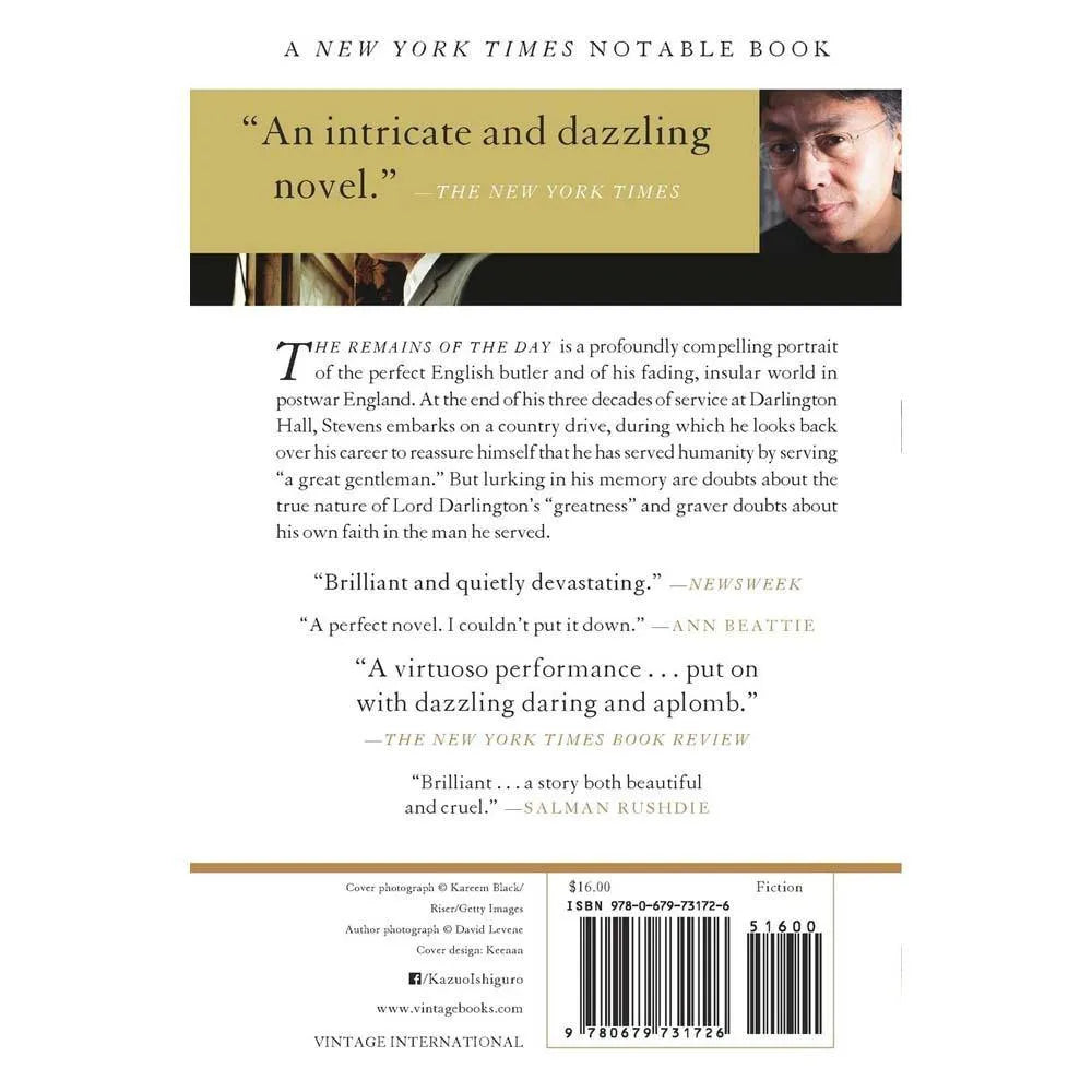 This is Kazuo Ishiguro's profoundly compelling portrait of a butler named Stevens. Stevens, at the end of three decades of service at Darlington Hall, spending a day on a country drive, embarks as well on a journey through the past in an effort to reassure himself that he has served humanity by serving the "great gentleman," Lord Darlington. But lurking in his memory are doubts about the true nature of Lord Darlington's "greatness," and much graver doubts about the nature of his own life.
