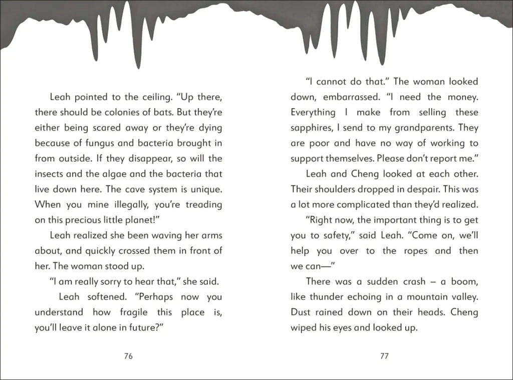 In this story, Leah the biology explorer and Cheng the geology expert are sent on a daring mission to a network of caves in India. However, when they get there they realize there’s more to this mission than meets the eye. The gripping narrative is filled with scientific facts as the explorers navigate the subterranean world and come across the animals that live there.