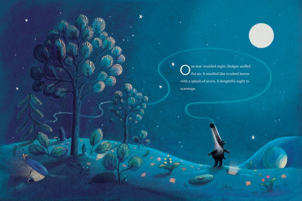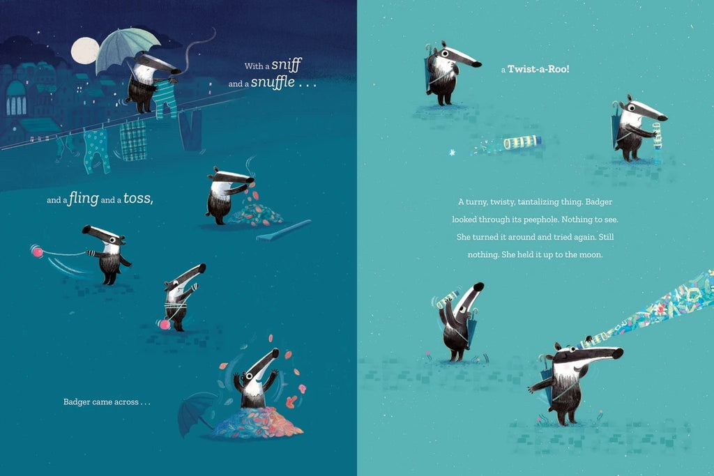 Winter is fast approaching the forest and everyone is storing food for a long hibernation, except Badger who is determined to find something fun to play with during the cold months ahead. After poking around in people town, Badger finds a Twist-a-Roo. It makes flashy shapes, splashy shapes, and shapes that slide and slip! It’s perfect for brightening Badger’s den with lots of color. But when the snow starts piling on deeper and deeper, Badger’s cupboards go bare! All that razzle dazzle can’t fill her belly. Then…knockity-knock. Someone’s at the door!