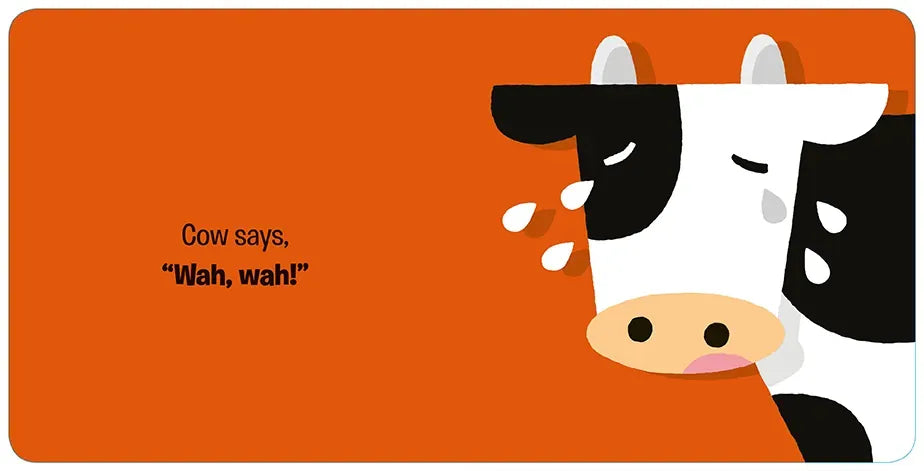 The answer to the question “What does the animal say?” takes a clever turn when a “cluck, cluck,” a “woof, woof,” and a “moo, moo” are met with a toddler’s “wah, wah!” Uh-oh! Now the frog also says “wah, wah!” and the other animals follow suit, shedding big tears, until the child speaks the magic words to comfort them all.