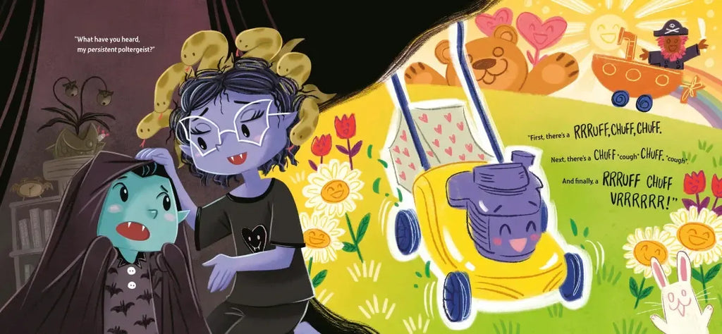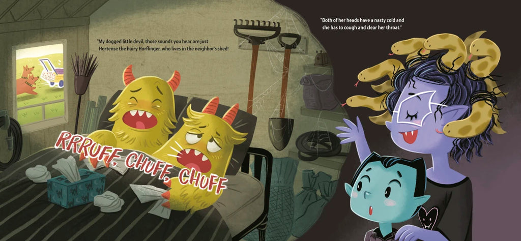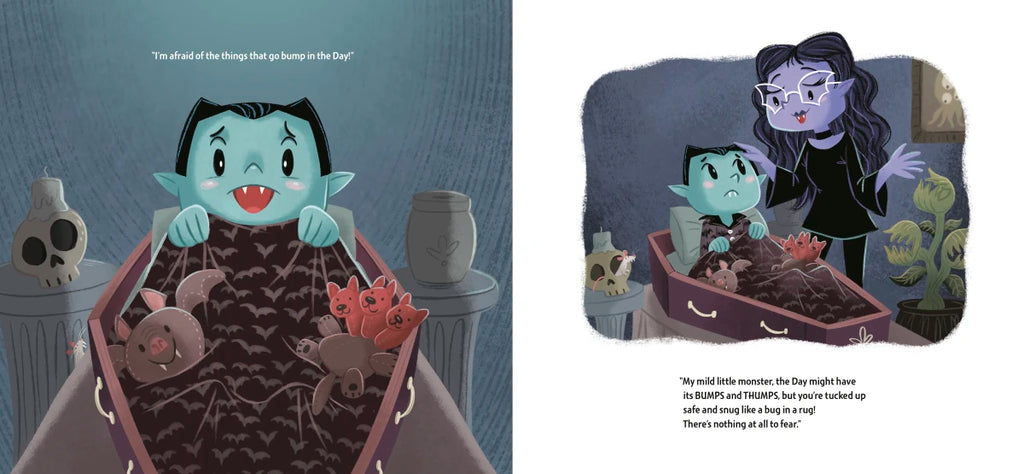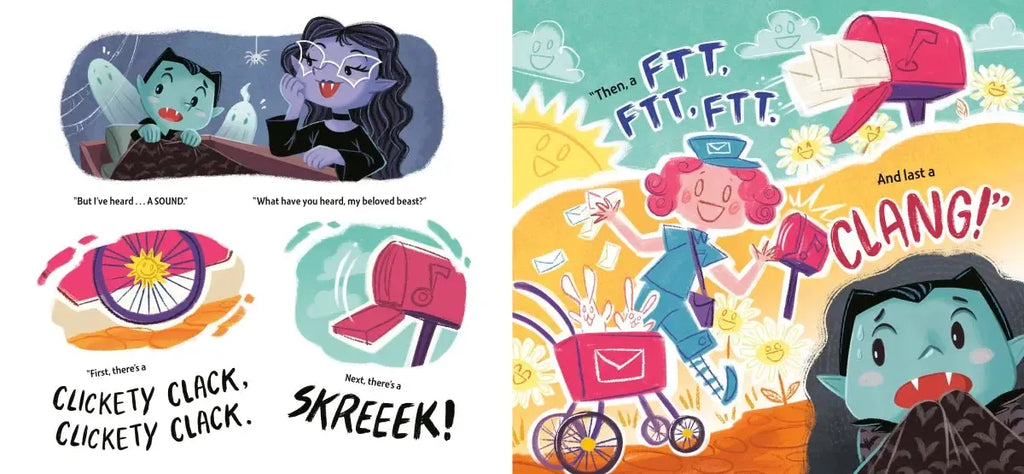 Vampire Vlad is all tucked in, ready for bed. But his imagination runs wild when he hears all the daytime noises happening outside. A clickety-clack, a skreek and a clang? Who knows what that could be!