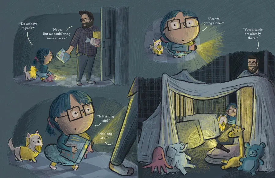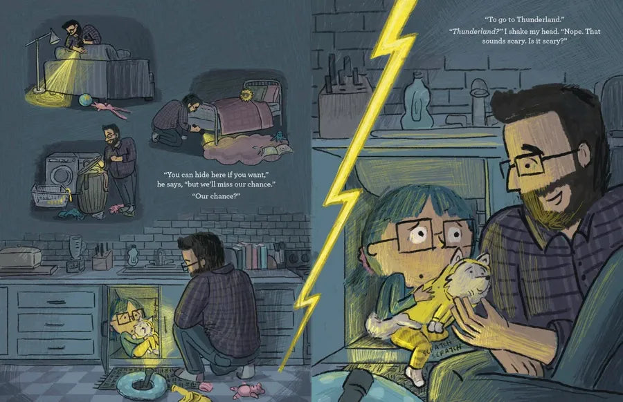 Until her dad shows her there’s somewhere even better to go. Thunderland! Where the cocoa is hot, stuffed animal friends are waiting, and storms have names. By playing a game instead of running away, the booms of thunder and flashes of lightning become a whole lot less intimidating. So, the next time the rain rolls in and the sky starts to roar, she knows she can face her fears in Thunderland!