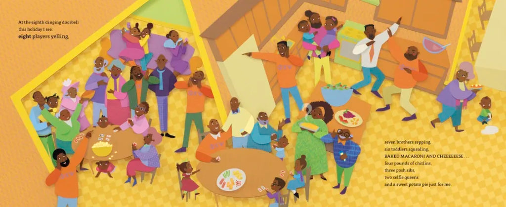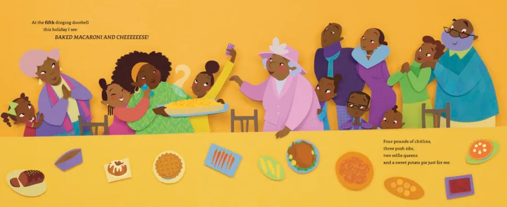 Every holiday, aunties, uncles, cousins, grandparents, and neighbors come over to eat, sing, and celebrate life. But all our main character can think about is the sweet potato pie Granny makes just for her. As tables fill with baked macaroni and cheese, chitlins, and other sides a-steaming, she and Granny move the pie to keep it intact. The task becomes tricker as the room grows with dancing and card games and pie cravings. Just when all seems lost and there’s no more pie, Granny pulls out a sweet surprise.