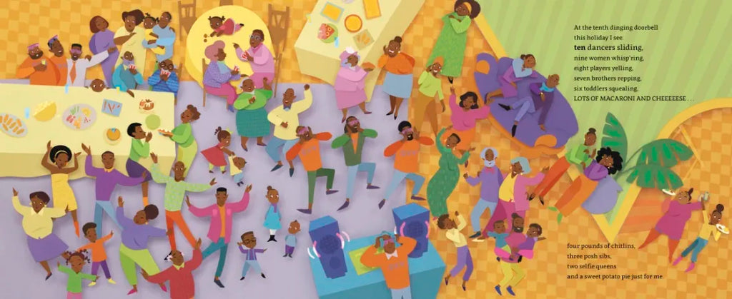 Written to the tune of “The Twelve Days of Christmas,” Twelve Dinging Doorbells is exuberant. Author Tameka Fryer Brown’s cumulative rhyme is impossible to resist, and the humorous details in Ebony Glenn’s cut-paper collage will welcome readers to this party again and again.
