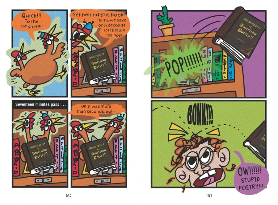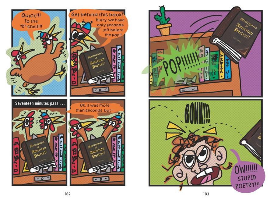 The two-headed chicken is back, with twice the adventure, twice the jokes, and a lot more heads (wait, did they just accidentally turn into a double-headed space snake?). Having lost the Astrocap™ somewhere in the multiverse, our intrepid hero dons the Timecap™ to scour the timestream, which looks a lot like broccoli, in search of it. But danger and drama await with every time-hopping POOZB! of the Timecap™, including hungry dinosaurs, fierce werewolves, poet Emily Dickinson, a fish with a mustache who wants to talk about feelings, and even the return of the chicken’s archenemy, Kernel Antlers, the shape-shifting moose! With lively art and quirky nods to history and literature, readers will be swept along for oodles of zany escapades—and brought into the book itself through games, puzzles, drawing activities, and even as a vital character. Tom Angleberger’s absurdist humor shines on every page of this nonstop ride.