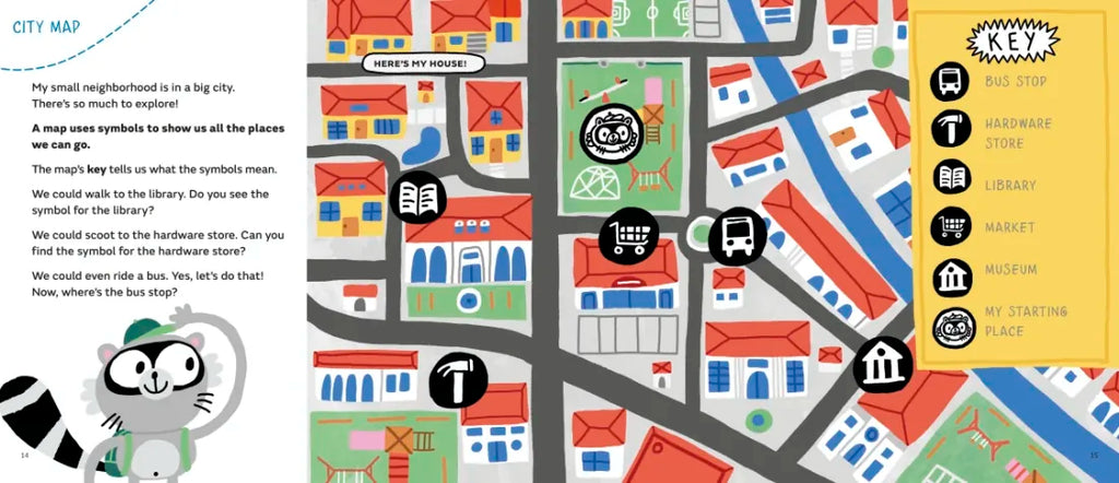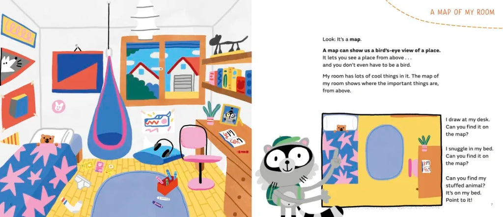 A raccoon narrator embarks on a big adventure in this exciting exploration of maps for the youngest readers. Traditional maps of cities, roads, and parks are joined by some less conventional ones such as inside the body, each one methodically introduced with humor and clear explanation. A clever, colorful, and engaging first look at constructing and decoding maps.