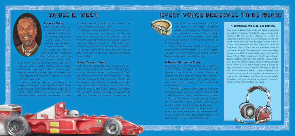 Did you know that James West invented the microphone in your cell phone? That Fred Jones invented the refrigerated truck that makes supermarkets possible? Or that Dr. Percy Julian synthesized cortisone from soy, easing untold people’s pain? These are just some of the black inventors and innovators scoring big points in this dynamic look at several unsung heroes who shared a desire to improve people’s lives. Offering profiles with fast facts on flaps and framed by a funny contemporary story featuring two feisty twins, here is a nod to the minds behind the gamma electric cell and the ice-cream scoop, improvements to traffic lights, open-heart surgery, and more — inventors whose ingenuity and perseverance against great odds made our world safer, better, and brighter.