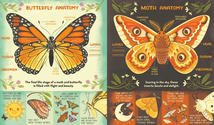 Butterflies soar in the sunlight. While moths flutter under the moon and stars.
