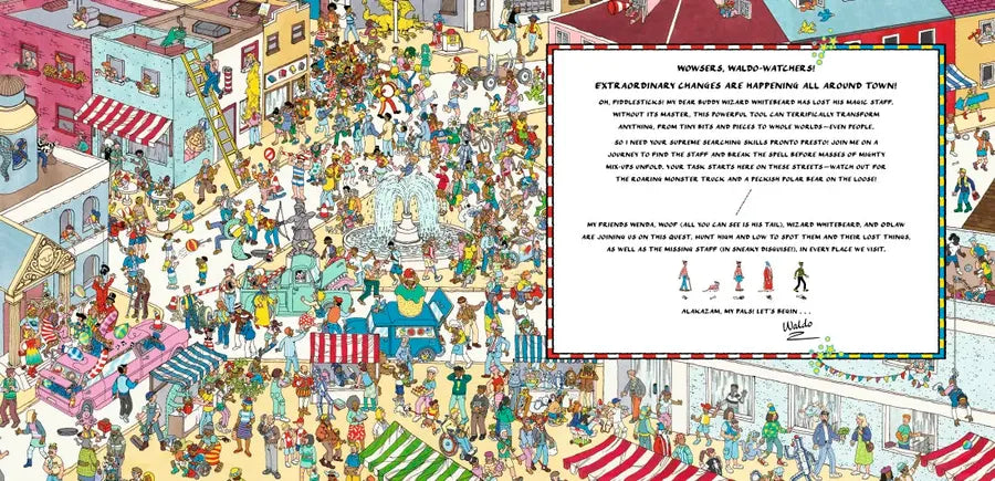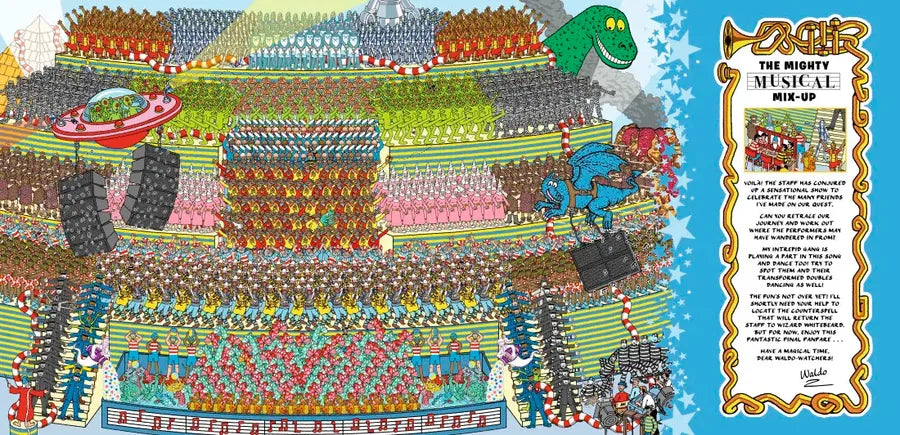 Wizard Whitebeard has lost his magic staff, and it’s stirring up mischief everywhere. Dragons are making a spectacle at the seaside, robots have crash-landed in the Stone Age, dinosaurs are wandering in the Wild West, there’s a sticky situation at a castle made of cake . . . The magical mayhem seems unstoppable! Follow Waldo and his friends on a quest to find the sneaky staff and unravel this mighty mess. With twelve marvelously mixed-up scenes and hundreds more things to look for, Where’s Waldo? The Mighty Magical Mix-Up is a truly mesmerizing search adventure.