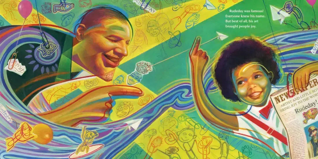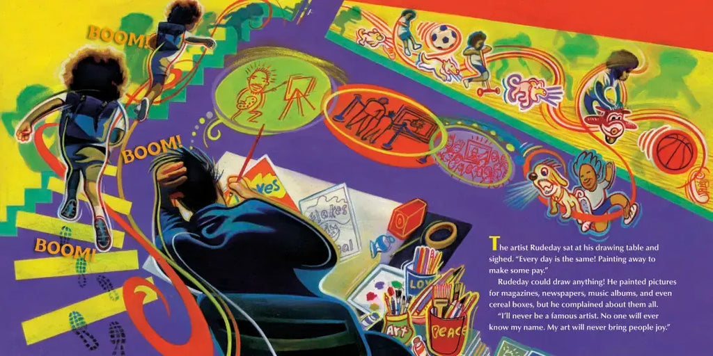 Rudeday dreams of creating art that brings people joy but instead, he paints to pay the bills. His days and nights are long, until one day he hears a Tap! Tap! Tap! at his window. What could it be? Rudeday sees a piece of string with a paper clip tied to the end of it, coming from the apartment upstairs. Rudeday has a brilliant idea.