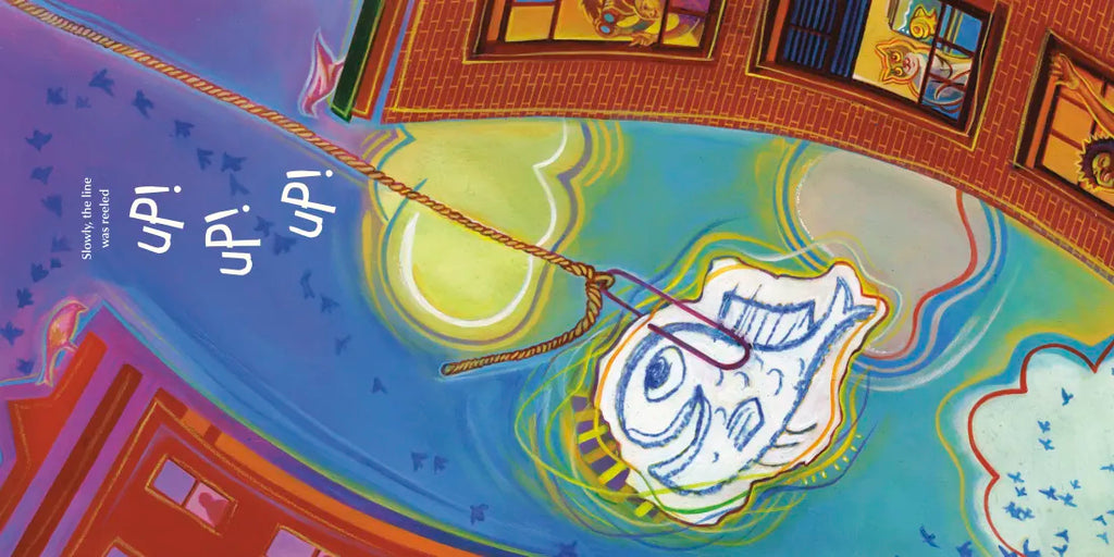 Rudeday carefully paints a fish and attaches it to the paper clip, starting a window-fishing exchange with a little boy upstairs. The pair swap paper fishes back and forth every day. Rudeday is finally painting for fun but he wonders if he will ever meet his window-fishing friend.