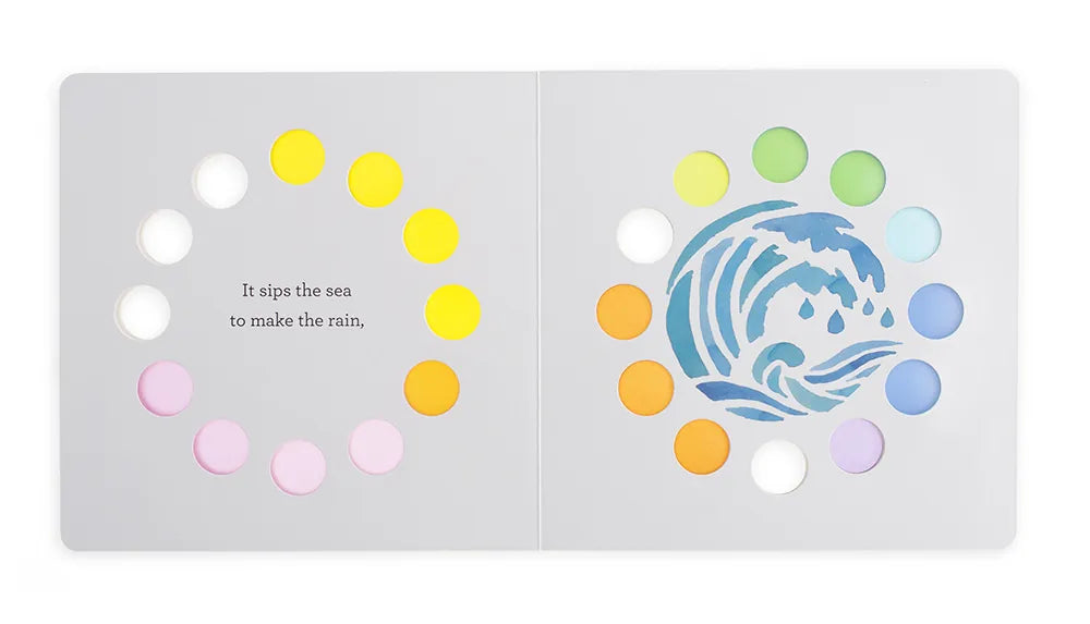 Open this beautiful book to find a graphic yellow sun surrounded by a halo of bright die-cut circles. Now hold the page up to the light and enjoy the transformation as the colors in those circles glow. In an elegant, sparely narrated ode to the phenomenon of light, Aaron Becker follows as light reflects off the earth to warm our faces, draws up the sea to make the rain, feeds all the things that grow, and helps to create all the brilliant wonders of the world, including ourselves.