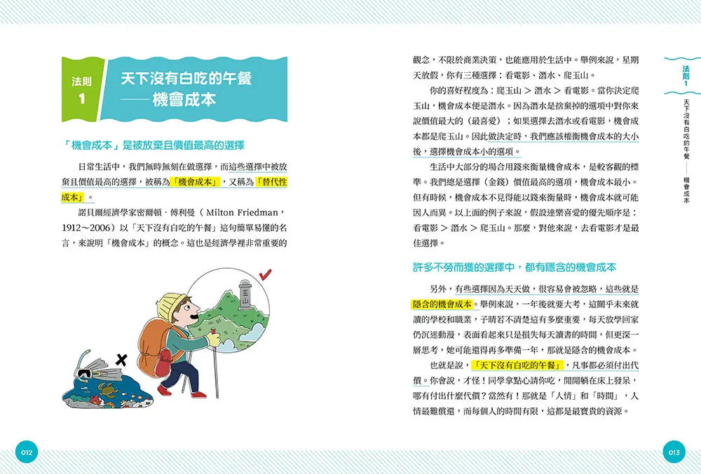 舉例來說,第一章描述從美國回臺的達樂表哥,為了感謝子晴爸爸接機,主動支付小費,是因為他認為子晴爸爸放棄自己珍貴的休息時間,開車去機場接他是損失了時間,所以達樂認為自己應當有所回報。你可以從中了解到,經濟學中的「機會成本」,就是從各種選擇中放棄且價值最高的選擇。接著再以國際社群媒體舉例,如:Facebook、Instagram、LINE等,用戶雖然可以免費註冊,但平臺同時也在蒐集用戶的數據,所以即使用戶沒支付金錢,他們仍然支付了成本——寶貴的個人資料被販售,或者被拿去另有他途,這就是「免費的代價」。