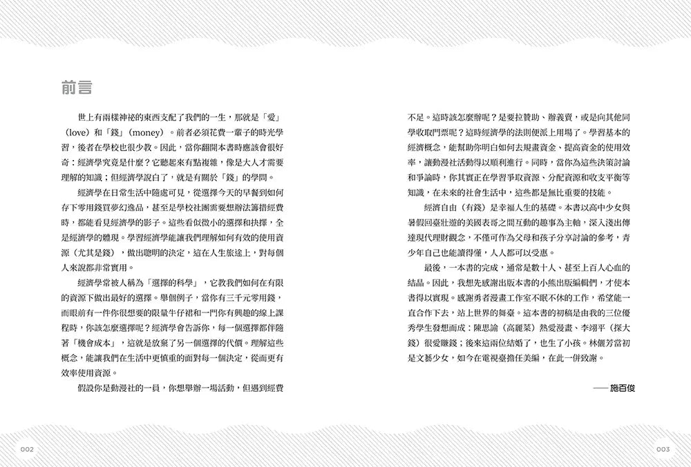 全書共15章,每一章皆以「情境式漫畫」和「國際商業案例」共同呈現,先藉由高中動漫社經費不足的漫畫故事,跟著角色們一起親身經歷募款失敗、打工賺錢、擺攤創業與借錢投資等事件,初步了解經濟學法則的概念;再藉由國際商業案例來說明如何在現實中活用經濟學法則,循序漸進的理解如何有效運用手邊的資源,做出最聰明的抉擇。