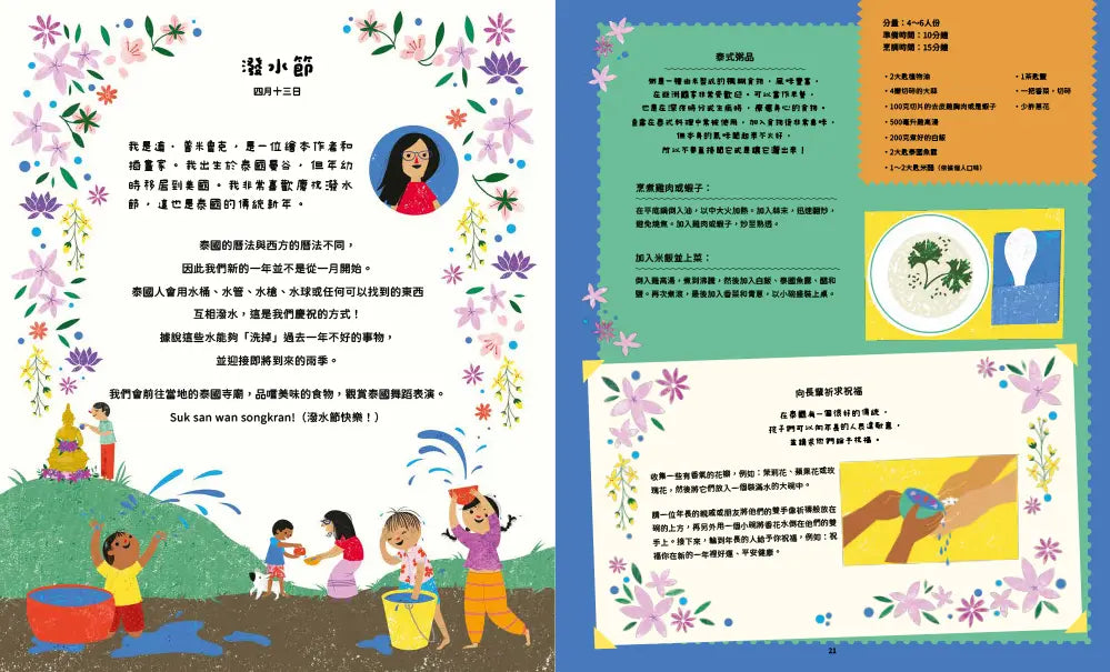 書中的每個節日不只講來由、介紹活動,更邀請讀者真的「一起玩」。有料理食譜可以參照下廚、有手作資訊讓親子可以一起動手,從潑水節的香花水到狂歡節的甜甜圈,每一頁都像是打開家門,讓全世界走進餐桌、客廳與廚房。節慶不再是遙遠的故事,而是全家人一起慶祝「今天」的理由。親子共讀的過程,也是建立家庭小儀式的起點。