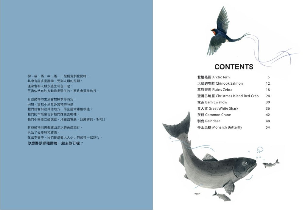 家燕、食人鯊、灰鶴、馴鹿、帝王斑蝶一起去旅行吧!
