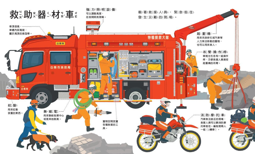 《災難救援車大集合》讓小朋友從車頭、車尾和側面來觀察救援車輛如何運作,