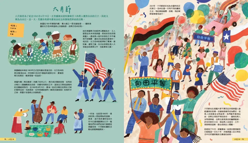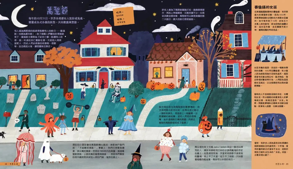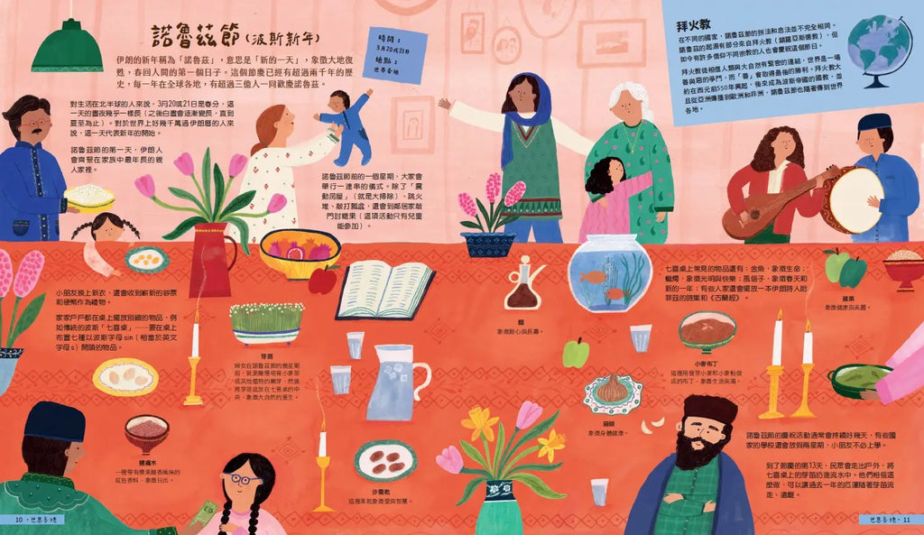 ▌繽紛全彩跨頁大場景:各國的傳統服飾、節慶布置、遊行或祭典儀式……每個細節都令人驚嘆!