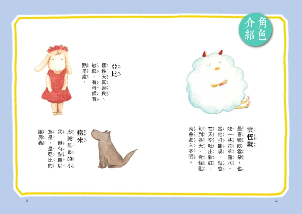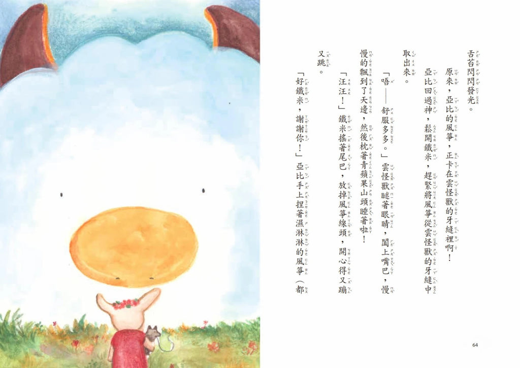 雲怪獸愛吃雲朵。她吞下雲朵,一打嗝便吐出一道彩虹。