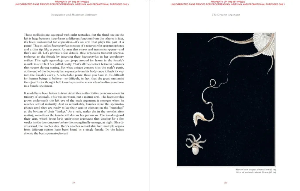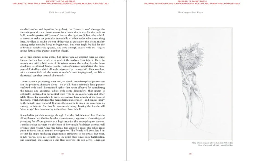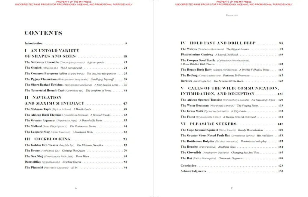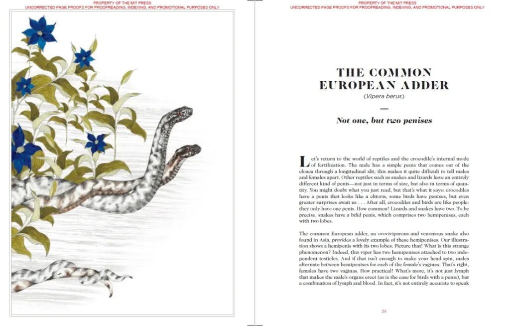 Emmanuelle Pouydebat, a natural history researcher, tells us about gutter penises, double penises, detachable penises, and corkscrew-shaped penises, as well as vaginas built for storage and clitorises with thorns. (Perhaps unsurprisingly, there’s more data about animal penises than animal vaginas and clitorises.) She explains how the ostrich achieves an erection, describes the courtship of pygmy chameleons, and recounts how the female short-beaked echidna chooses a partner. She reports on sexual assault among animals—there’s evidence that half of female mallards are sexually assaulted—and explains how masturbation helps squirrels avoid sexually transmitted diseases. It seems that animals have been composing their own Kama Sutra throughout the ages. Striking color illustrations accompany the text.
