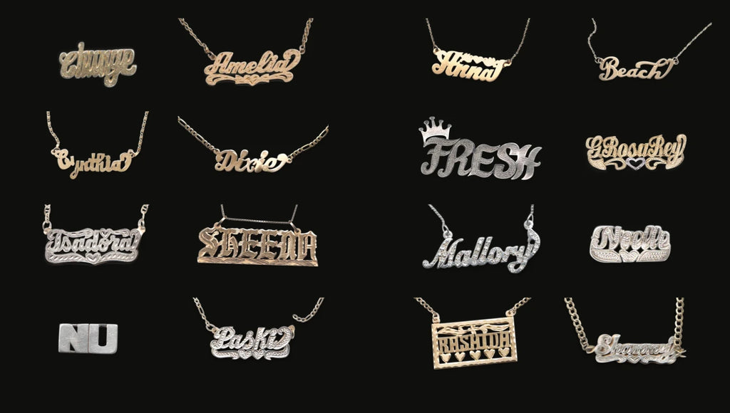 Nameplate jewelry comes in many shapes, styles, and sizes—from simple scripted pendants to bejeweled rings, belts, and bracelets with a first, last, and/or nickname. Like so many individuals who proudly wear nameplates, Marcel Rosa-Salas and Isabel Attyah Flower were first introduced to this storied jewelry during childhood. Their love of the nameplate style gradually blossomed into a wide-reaching research project, Documenting the Nameplate, through which they’ve spent years collecting photographs and testimonials from nameplate-wearers across the country and world.