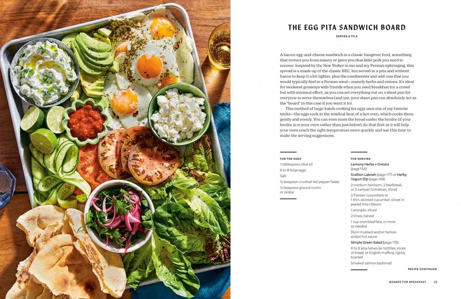 In Boards & Spreads, you won’t find cheese boards--instead, you’ll find simple ideas and scrumptious recipes for a variety of meals and snacks to share on platters or boards. From the Top-Your-Own Chili Board to the Crispy Chicken Bites Spread, and from the Charred Salad Platter to the Egg Pita Sandwich Board, you’ll find something for every meal and mood. Even drinks can be served in this fun fashion, whether it's a Bloody Mary Bar at brunch or low-ABV cocktails at an afternoon picnic. There are also plenty of quick recipes for dips, spreads, and other tempting add-ons you'll turn to time and again, like Smashed Olives, Quick-Pickled Shallots and Jalapenos, and Two-Minute Feta Dip.