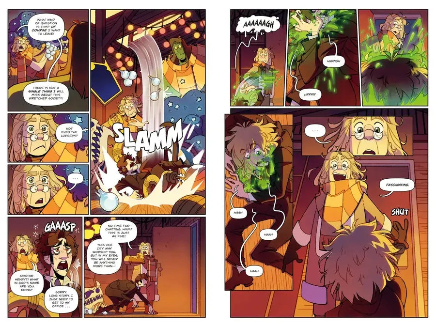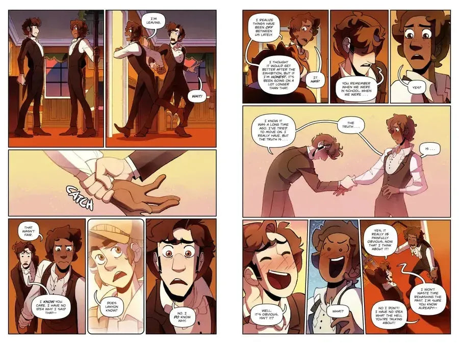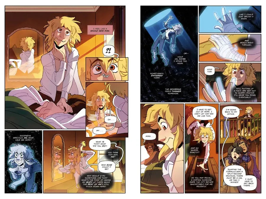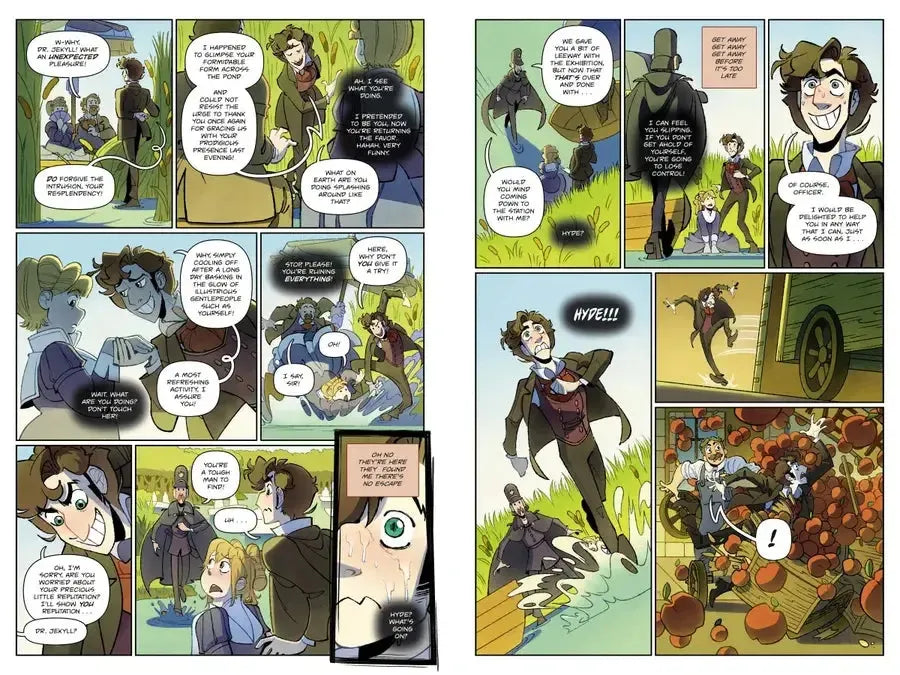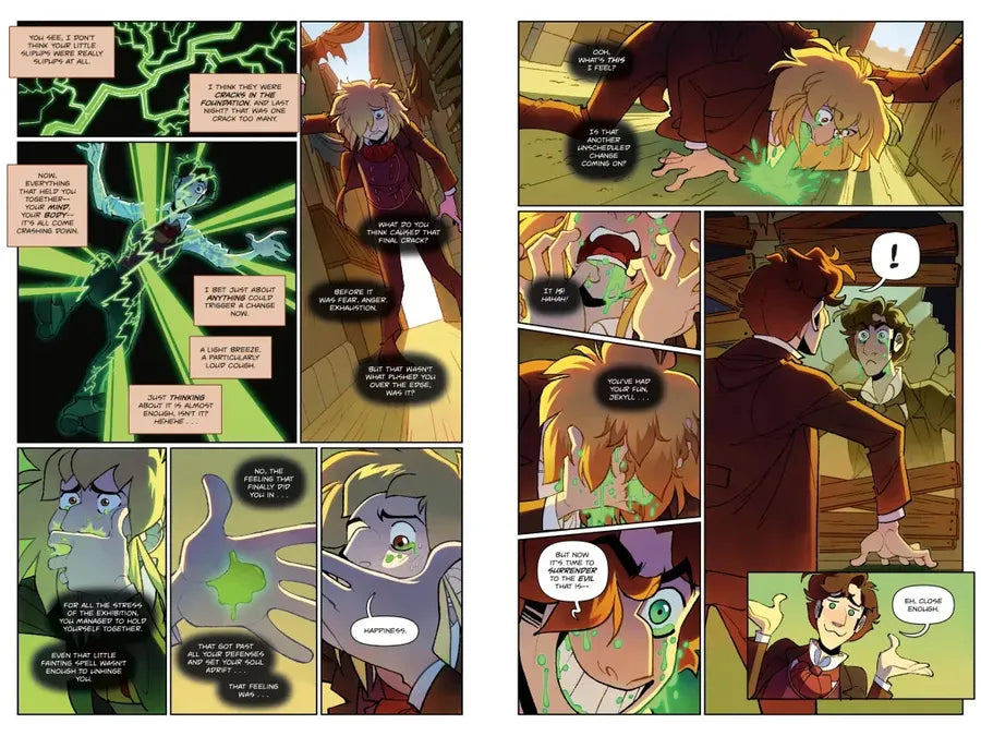 Last we saw Dr. Jekyll he was on stage about to welcome everyone to his grand exhibition—the event meant to save his Society for Arcane Sciences and his way of life—when he collapsed, pulled under by his devilish alter ego Mr. Hyde. When he wakes, Jekyll assumes everything is doomed, but in a surprise to just about everyone, he couldn’t be more wrong. The event was a success, his band of rogue scientists now all have patrons, and business is booming. What’s more, he even plucks up the courage to do the scariest, craziest thing of all: confess his feelings for Lanyon. Everything is finally coming up Jekyll!