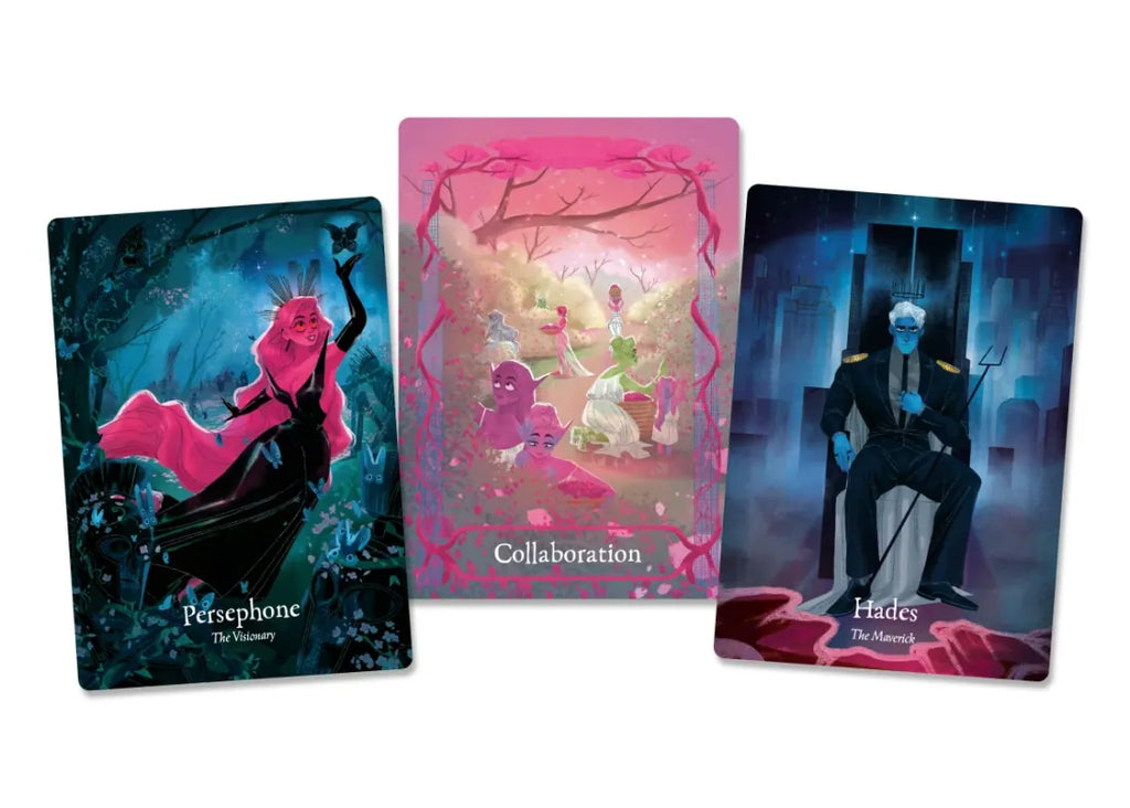 Featuring all-new artwork inspired by the original comic, this 54-card deck brings the characters of the reimagined Greek pantheon to life with gorgeous portrait cards, as well as attribute cards that explore themes from Lore Olympus like Metamorphosis, Autonomy, and Reassurance.