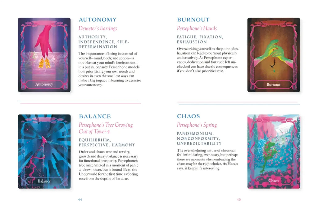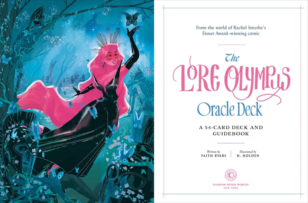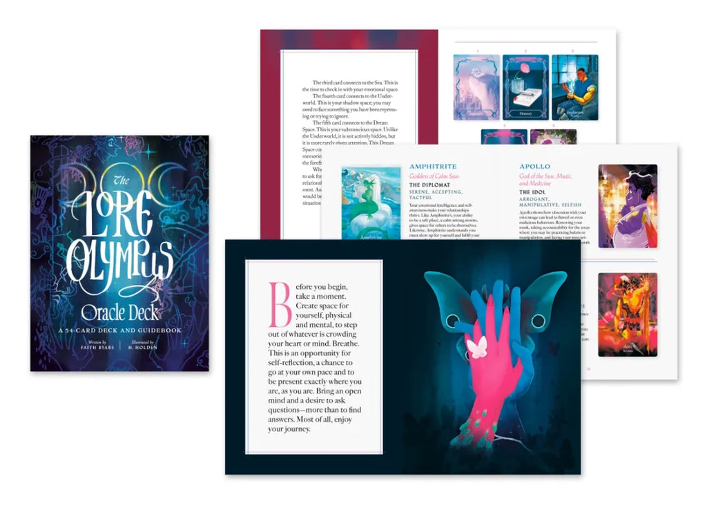 The deck is accompanied by a booklet to explain potential meanings of each card, and suggested divination readings—including both traditional oracle spreads and reimagined readings in the tradition of Lore Olympus—to help you process your day and intuit a path forward.