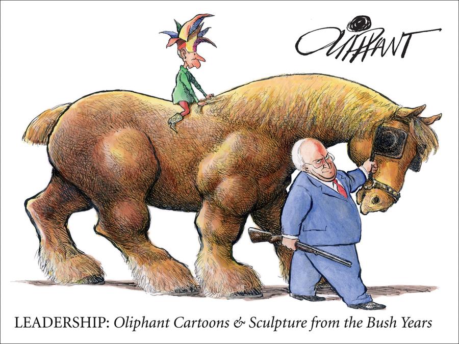 Neither Democrat nor Republican is safe from the influential paintbrush of political commentator and cartoonist Pat Oliphant. A master of what he calls "confrontational art," Oliphant spares no one as he covers Bush's tenure in office-drawing comparisons on the war in Iraq to Vietnam, Kim Jong Il's nuclear antics to a circus act, and President George W. Bush's time in office with the reign of The Little King.