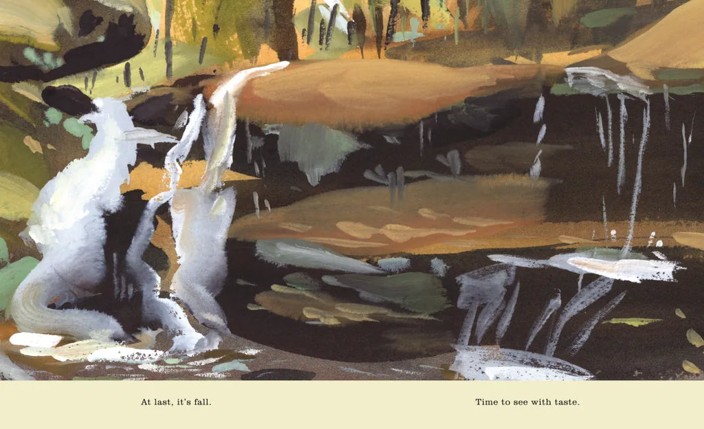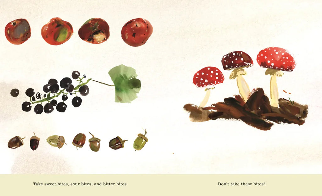 Stay with the mountain for all four seasons, and you can truly get to know it. See the mountain with your hands in the winter, digging in the snow. With your nose in the spring, breathing in the rain and mud. With your ears in the summer, when the birds caw caw and thunder booms, and in autumn, with your tongue, biting into sweet apples and earthy mushrooms.