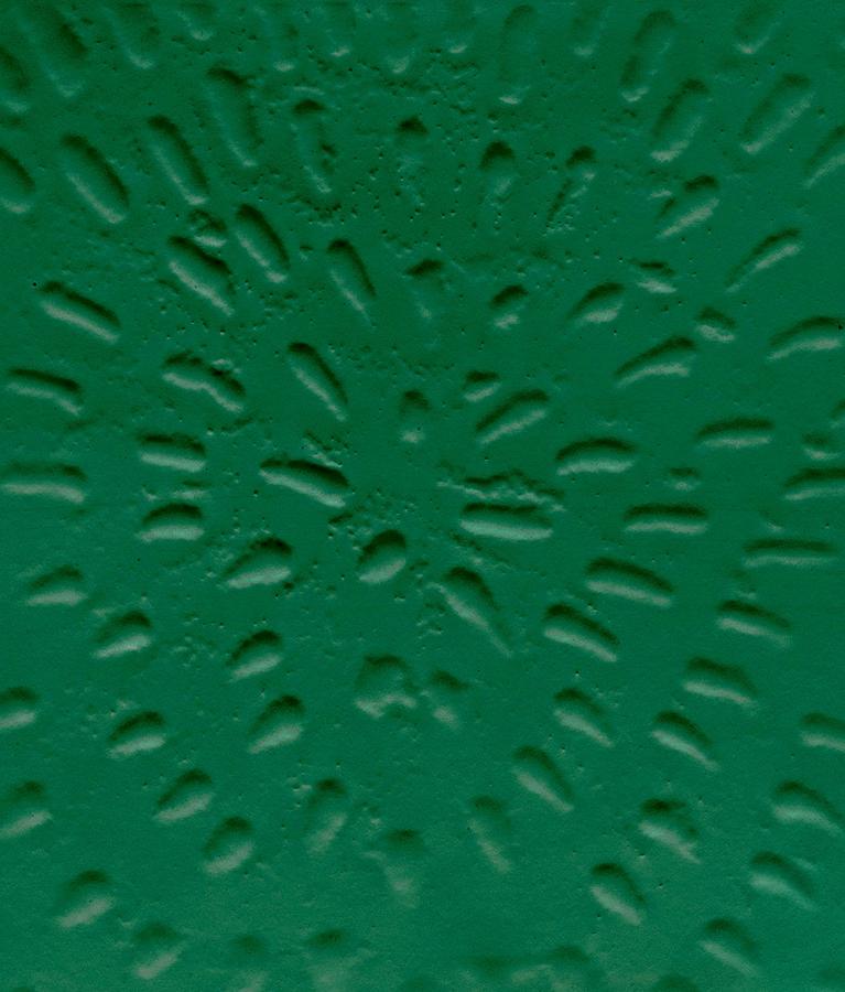 Jennifer Guidi's "sand paintings" mix oil paint with sand to create surfaces of color and texture. Evolving from her earlier figurative works, these abstract sand paintings evoke the traditions of landscape and naturalist painting. Accomplished by applying a thick layer of sand to the painted ground and then making precise marks while the sand is still wet, the paintings' luminous qualities and their textured relief register and generate minute shifts in perception, creating their own sense of ambient light. These physical and tactile emanations are based on her observations of light in Los Angeles, where she lives and works, and where hazy skies caused by the atmospheric conditions of the West Coast, as well as the city's man-made pollution, make for extra-brilliant sunsets.