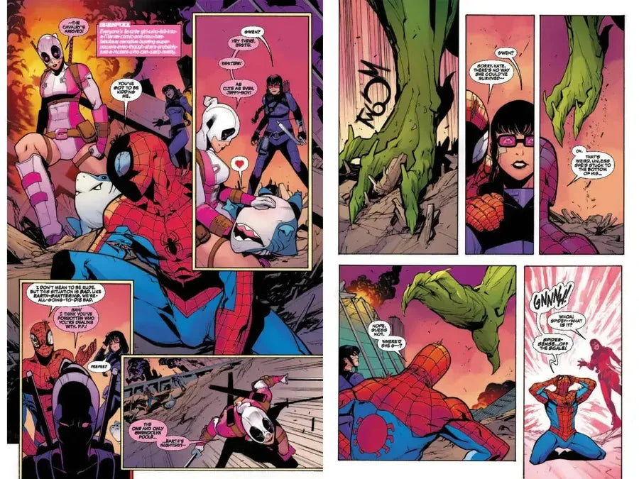 Everyone’s favorite reality-twister’s life is changing, becoming darker...grittier...and now she’s bringing her own brand of hyper-violent justice to a battle-strewn NYC! Who is this dark Gwenpool? And what has she have to do with the Spectacular Spider-Man? Guest-starring Fin Fang Foom and Jeff the Land Shark, this one will shock you to your core!