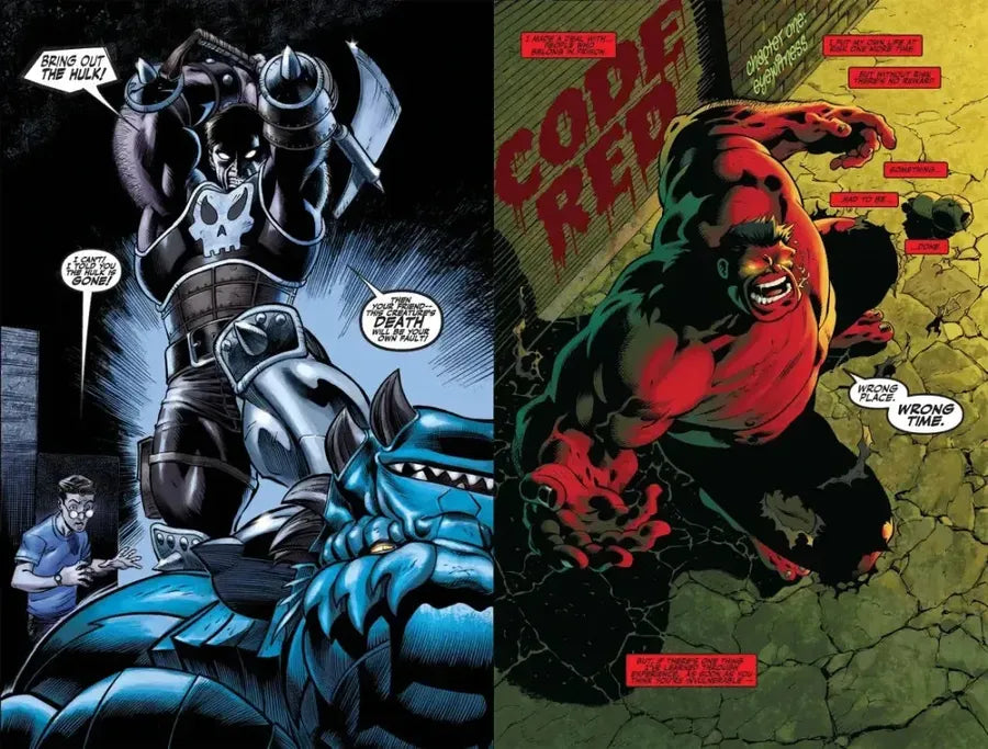 Domino might have just discovered the Red Hulk’s identity, and he can’t have that. But X-Force is protecting her, so Rulk recruits a little help of his own. Enter Code Red: Punisher! Deadpool! Elektra! Thundra! Crimson Dynamo! But whose side is the mysterious new Red She-Hulk on? Meanwhile, the Hulk is gone, transformed back to mild-mannered Bruce Banner — seemingly forever. But Banner knows the Hulk well enough to realize he never stays buried long. Traveling to a deserted corner of America, he finds the Hulk’s half-alien son Skaar waiting to take revenge on his father. The boy is young, angry...and powerful. But he’s not nearly a match for the Hulk. Not yet, at least. So now it’s up to Bruce Banner to train the boy! But Norman Osborn has taken charge, and one item on the list for his Dark Reign is to bring back the Hulk!