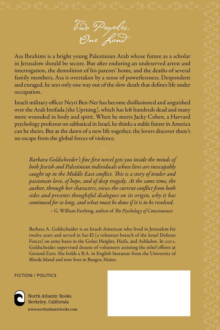 Based on events, organizations, and locations that Barbara Goldscheider experienced while working on army bases throughout Israel, Al-Naqba, The Catastrophe follows the parallel stories of an elite Palestinian Arab and an officer of the Israeli Defense Forces. Asa Ibrahimi’s infatuation with the daughter of a desert sheikh is brutally ended when he’s arrested and beaten in the Russian Compound, two of his brothers are killed by Israeli soldiers, and his parents’ home in Ramallah is demolished. Israeli Colonel Neyri Ben-Ner attempts to begin a new life far from the instability of his country by going to Harvard and marrying an American woman. But a return to Israel brings him back to the horror of suicide bombings and mass murders. Both face a personal and political transformation with ramifications beyond their own lives. This epic novel blends drama, suspense, and romance, in the process tallying the tragedies to both parties in this seemingly unstoppable conflict.