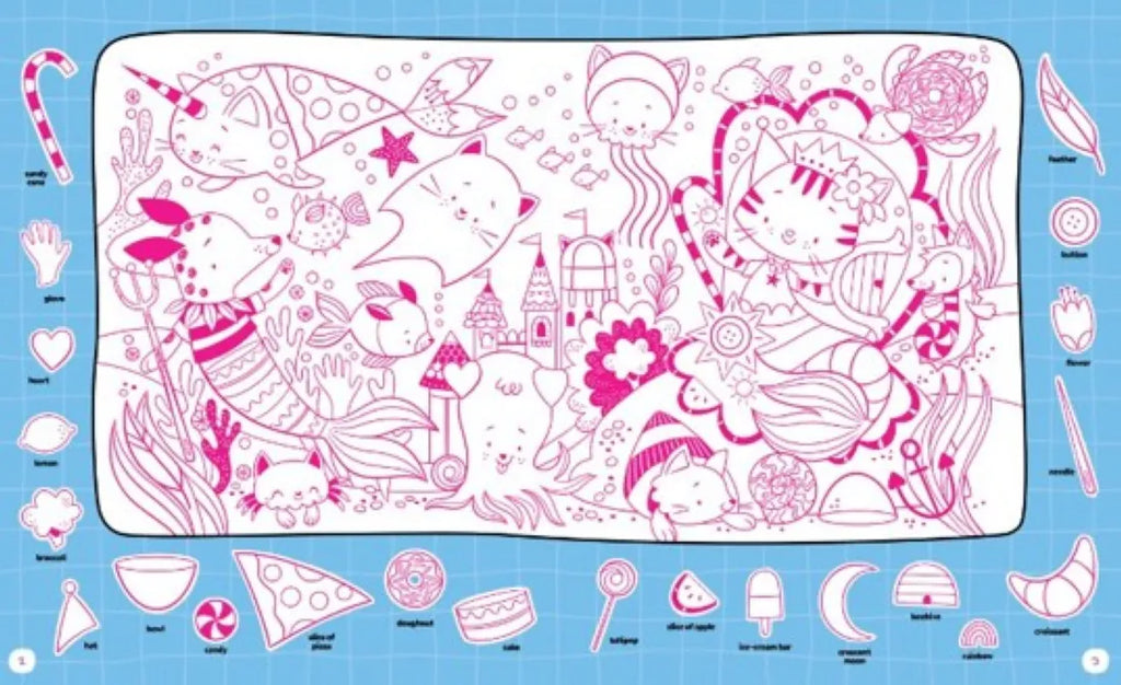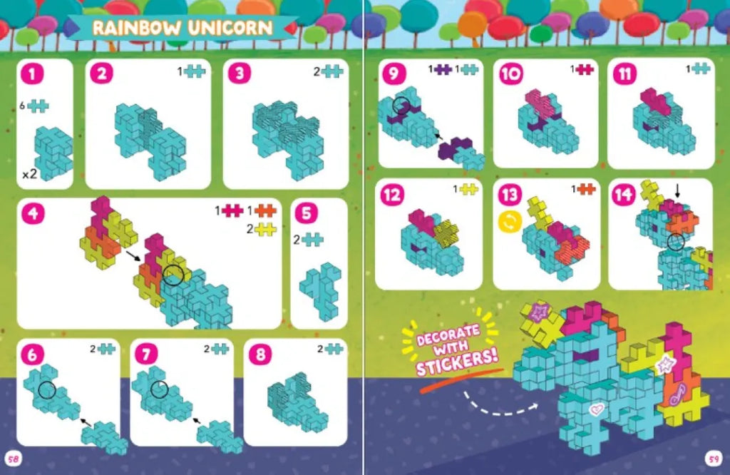 This all-in-one play set glows with bright neon fun, cuteness, and creativity. Neon Super Cute Puzzle and Play combines 40+ bright and bold Hidden Pictures puzzles with 100 award-winning Plus-Plus pieces in neon colors—so kids can build a narwhal, a unicorn, or anything else they can imagine. Two sheets of stickers add extra personality to both the puzzles and the builds, while the built-in idea guide keeps inspiration flowing.